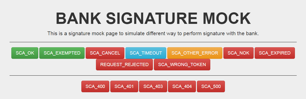 In order to test this redirect approach, the sandbox provides a graphical user interface in order to simulate all the possible SCA scenarios (Login fails, timeout, SCA rejected…) that are listed below: